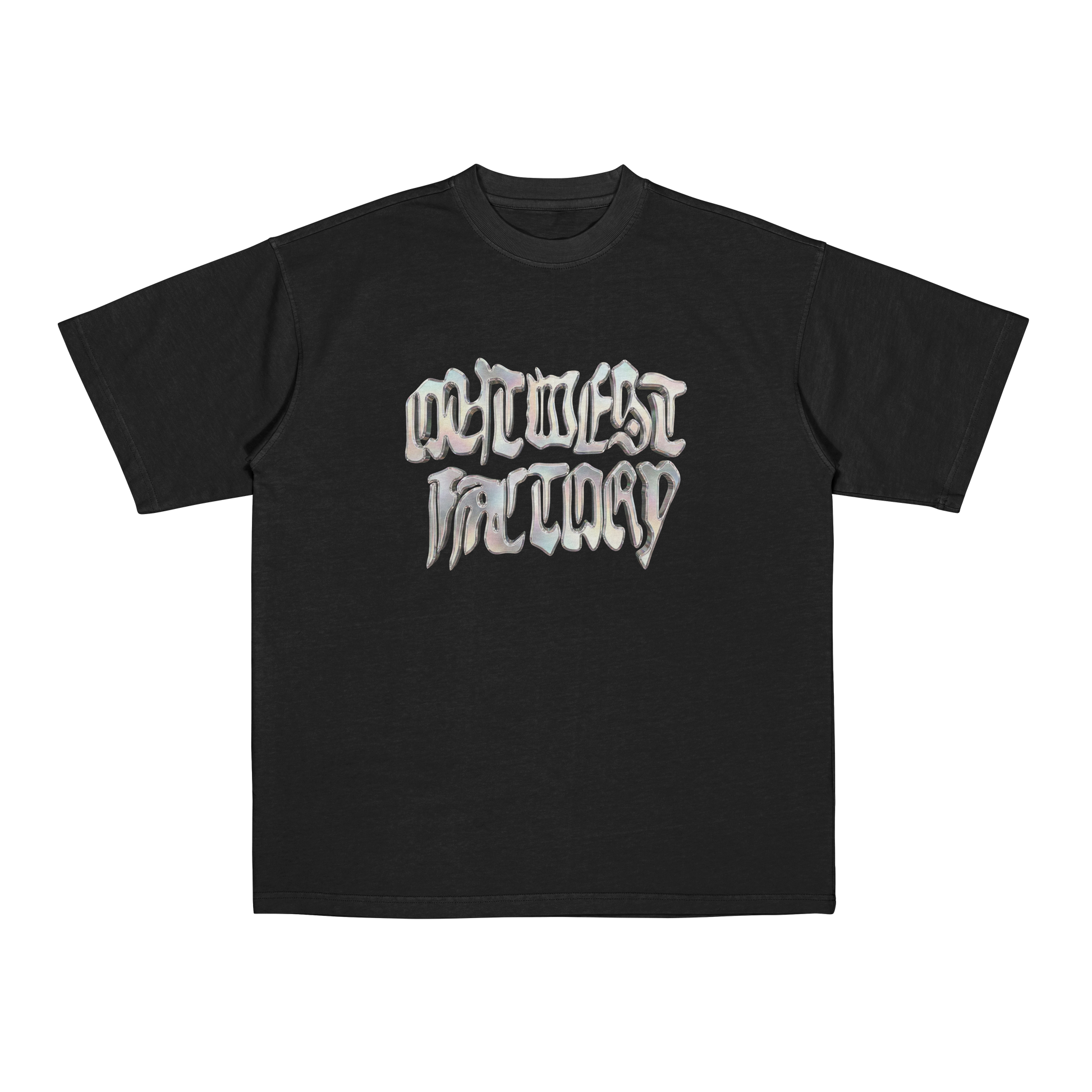 The front graphic features the OUTWEST FACTORY chrome “melt” lettering, high-contrast, metallic, and slightly eerie in the best way. Minimal tee, statement finish.